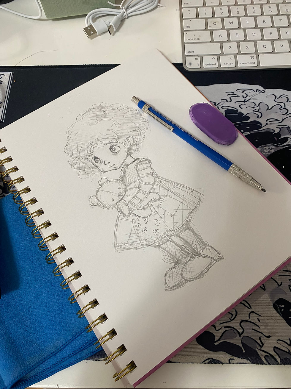 I envisioned this poor little girl that stays up too long at night because sometimes the life is scary and she doesn't really know how to navigate it, so maybe some dark circle around her eyes would be necessary too.